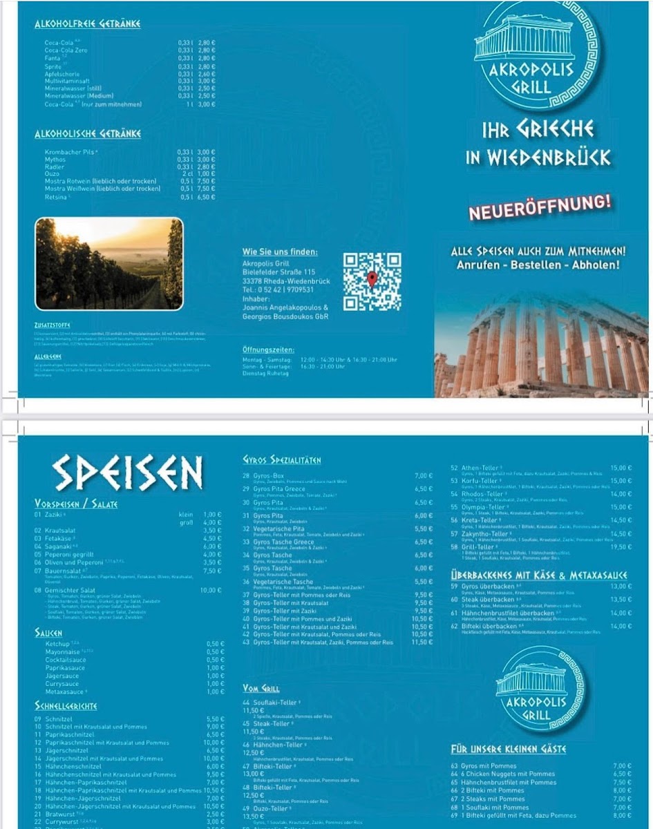 Welcome to Akropolis Grill, a delightful Greek gem located on Bielefelder Str. 115 in Rheda-Wiedenbrück. This charming eatery has quickly become a local favorite, renowned for its authentic Greek cuisine that tantalizes the taste buds. Dive into their signature Gyros Teller, praised for its perfectly seasoned, juicy meat and crispy crust, garnished with a heavenly Tzatziki sauce—an absolute must-try according to satisfied patrons.